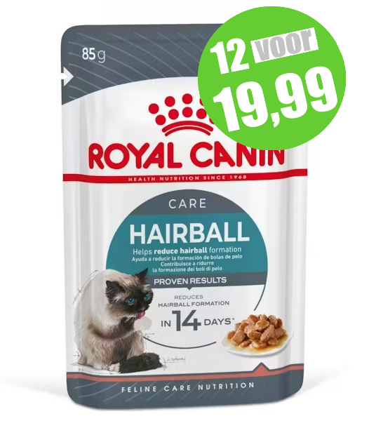 Royal Canin Hairball Care in Gravy (brokjes in saus) is een complete en uitgebalanceerde voeding die speciaal is ontwikkeld om de vorming van haarballen te helpen verminderen. Deze voeding is samengesteld om de darmpassage te helpen bevorderen en zo ingeslikte haren via de ontlasting te laten uitscheiden. Royal Canin Hairball Care heeft bewezen resultaten. Uit een interne studie* van Royal Canin blijkt dat deze voeding de vorming van haarballen bij de deelnemende katten na 14 dagen gebruik van het Hairball Care-voedingsprogramma (droog- en natvoeding) vermindert. Royal Canin Hairball Care is ook verkrijgbaar in de vorm van brokjes in gelei of droogvoeding (brokken). Door natvoeding en droogvoeding te combineren, bied je je kat de variatie waar ze zo van houdt.