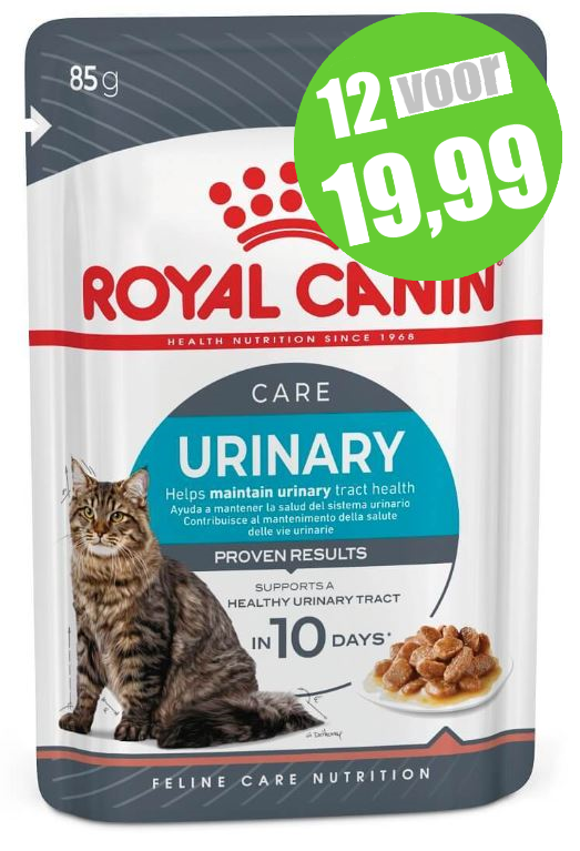 Royal Canin Urinary Care in Gravy (brokjes in saus) is een complete en uitgebalanceerde voeding die speciaal is ontwikkeld om de urinewegen in optimale gezondheid te helpen houden. Urinary Care heeft bewezen resultaten. Uit een interne studie van Royal Canin blijkt dat deze voeding bijdraagt tot gezonde urinewegen na 10 dagen gebruik van het Urinary Care-voedingsprogramma (combinatie van droogvoeding en natvoeding). Urinary Care is ook verkrijgbaar in de vorm van brokjes in gelei of droogvoeding (brokken). Door natvoeding en droogvoeding te combineren, bied je je kat de variatie waar ze zo van houdt.
