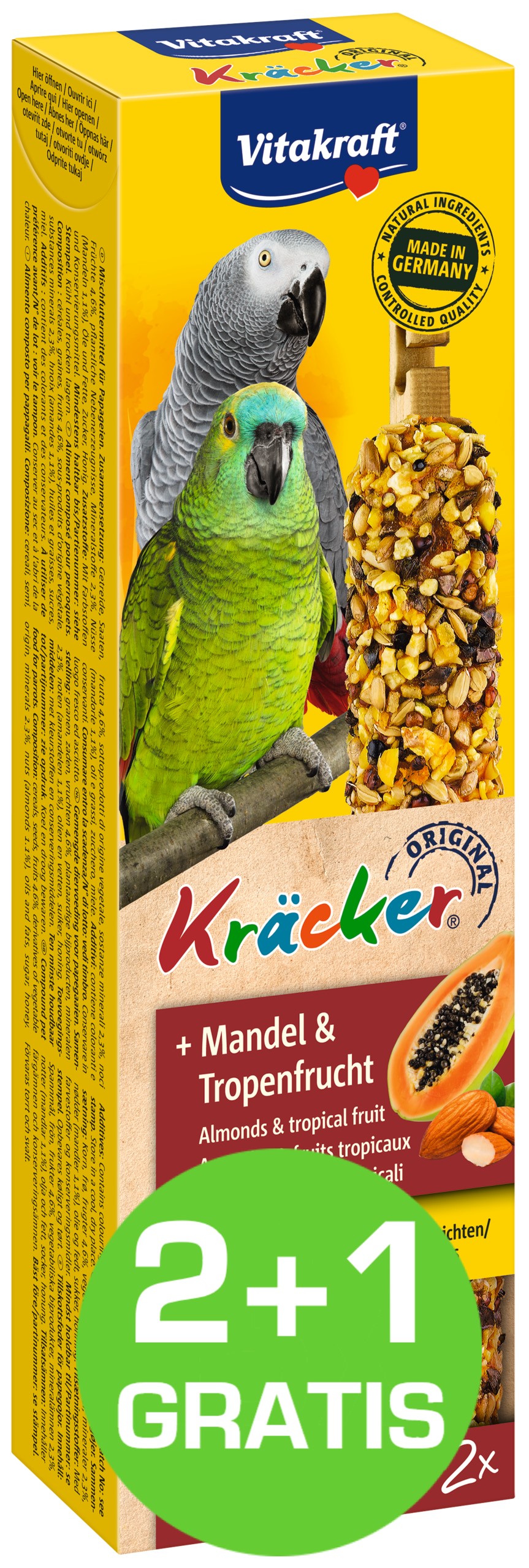 De originele Vitakraft Kräckers zijn een verantwoorde lekkernij en bevatten lekkere zaden, amandelstukken, bananen en papaya op een natuurlijk knabbelhoutje met houten clip. De Kräckers zijn lekker van smaak en 3-voudig gebakken waardoor de ingrediënten stevig vastzitten en de papegaai bezig wordt gehouden zoals dit in de vrije natuur ook gebeurt. Dit zorgt ervoor dat de snavel van de papegaai op natuurlijke wijze afslijt. De Kräckers zijn afgestemd op de voedingsbehoefte van de vogel. Het Vital-Complex voorkomt gebreksverschijnselen en zorgt voor extra vitaliteit van het dier. De Kräckers bevatten waardevolle vitamines, zijn bereid volgens een suikervrije receptuur en zijn gemakkelijk in de kooi op te hangen door de cliphouder aan de Kräcker.