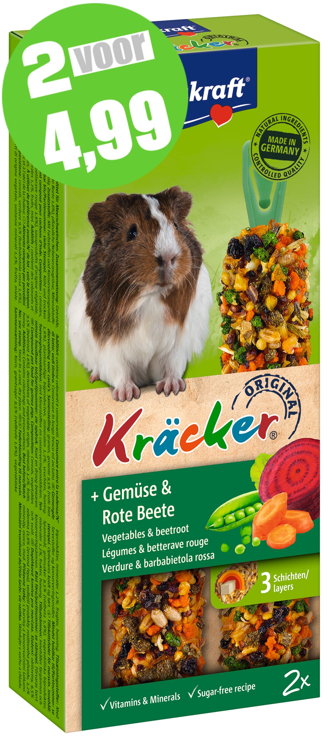 De orginele Vitakraft Kräckers zijn een verantwoorde lekkernij en bevatten lekkere granen, groente en bieten op een natuurlijk knabbelhoutje. De Kräckers zijn lekker van smaak en 3-voudig gebakken waardoor de ingrediënten stevig vastzitten en de cavia bezig wordt gehouden zoals dit in de vrije natuur ook gebeurt. Dit geeft de cavia de nodige beweging en zorgt ervoor dat hij zijn tanden op natuurlijke wijze kan afslijten. De Kräckers zijn afgestemd op de voedingsbehoefte van de cavia. Het Vital-Complex voorkomt gebreksverschijnselen en zorgt voor extra vitaliteit van het dier. Met waardevolle vitamines, extra vitamine C en bereid volgens een suikervrije receptuur.