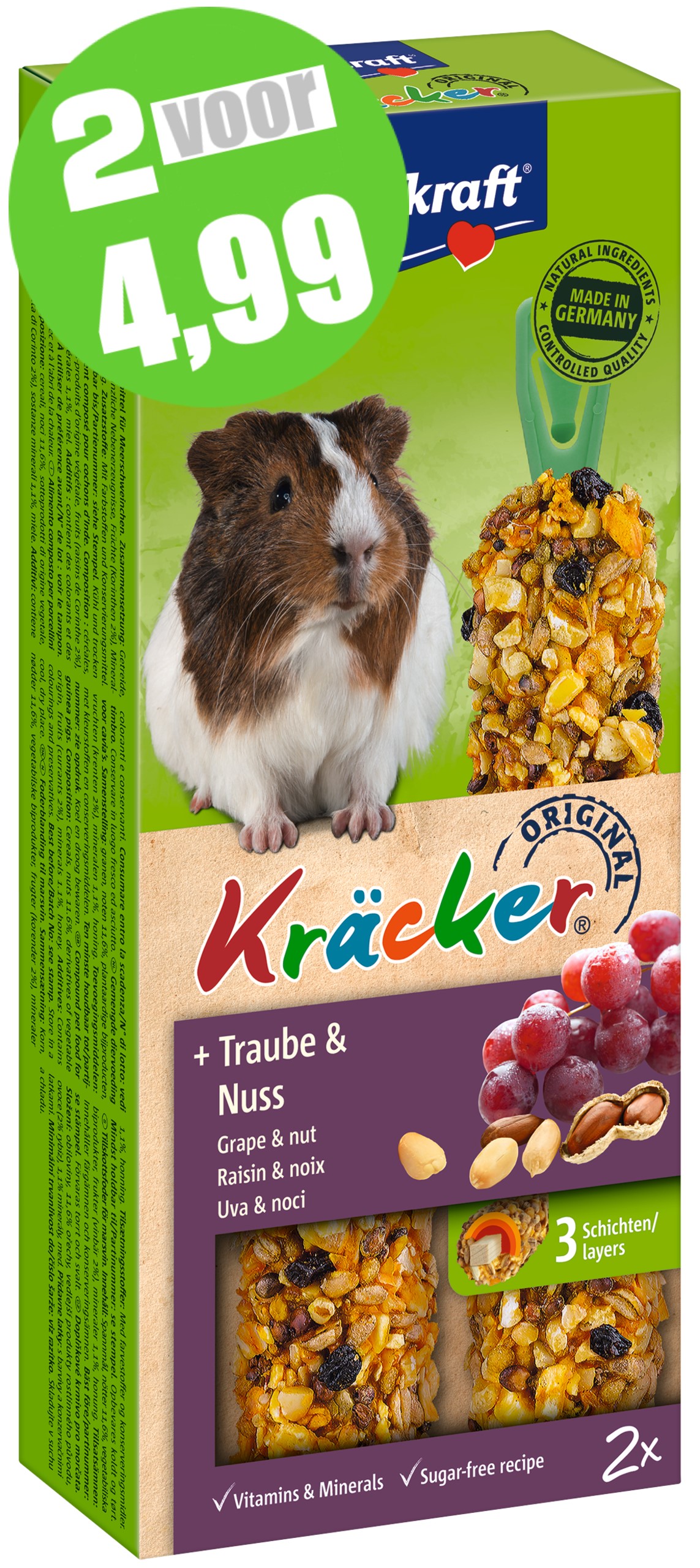 De orginele Vitakraft Kräckers zijn een verantwoorde lekkernij en bevatten lekkere granen, druiven en noten op een natuurlijk knabbelhoutje. De Kräckers zijn lekker van smaak en 3-voudig gebakken waardoor de ingrediënten stevig vastzitten en de cavia bezig wordt gehouden zoals dit in de vrije natuur ook gebeurt. Dit geeft de cavia de nodige beweging en zorgt ervoor dat hij zijn tanden op natuurlijke wijze kan afslijten. De Kräckers zijn afgestemd op de voedingsbehoefte van de cavia. Het Vital-Complex voorkomt gebreksverschijnselen en zorgt voor extra vitaliteit van het dier. Met waardevolle vitamines, extra vitamine C en bereid volgens een suikervrije receptuur.