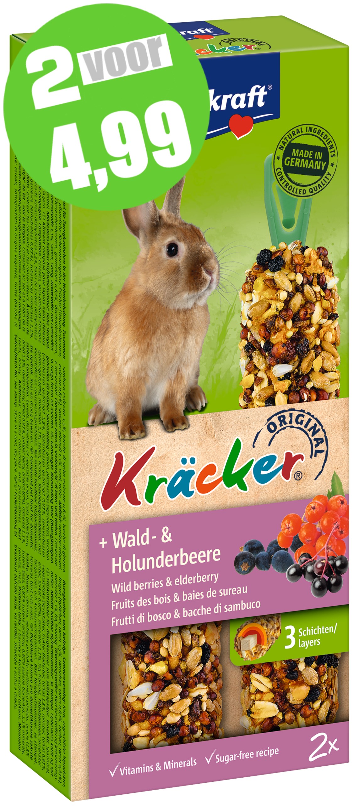 De orginele Vitakraft Kräckers zijn een verantwoorde lekkernij en bevatten lekkere granen, bosbessen en vlierbessen op een natuurlijk knabbelhoutje. De Kräckers zijn lekker van smaak en 3-voudig gebakken waardoor de ingrediënten stevig vastzitten en het konijn bezig wordt gehouden zoals dit in de vrije natuur ook gebeurt. Dit geeft het konijn de nodige beweging en zorgt ervoor dat hij zijn snijtanden op natuurlijke wijze kan afslijten. De Kräckers zijn afgestemd op de voedingsbehoefte van het konijn. Het Vital-Complex voorkomt gebreksverschijnselen en zorgt voor extra vitaliteit van het dier. Met waardevolle vitamines en bereid volgens een suikervrije receptuur.