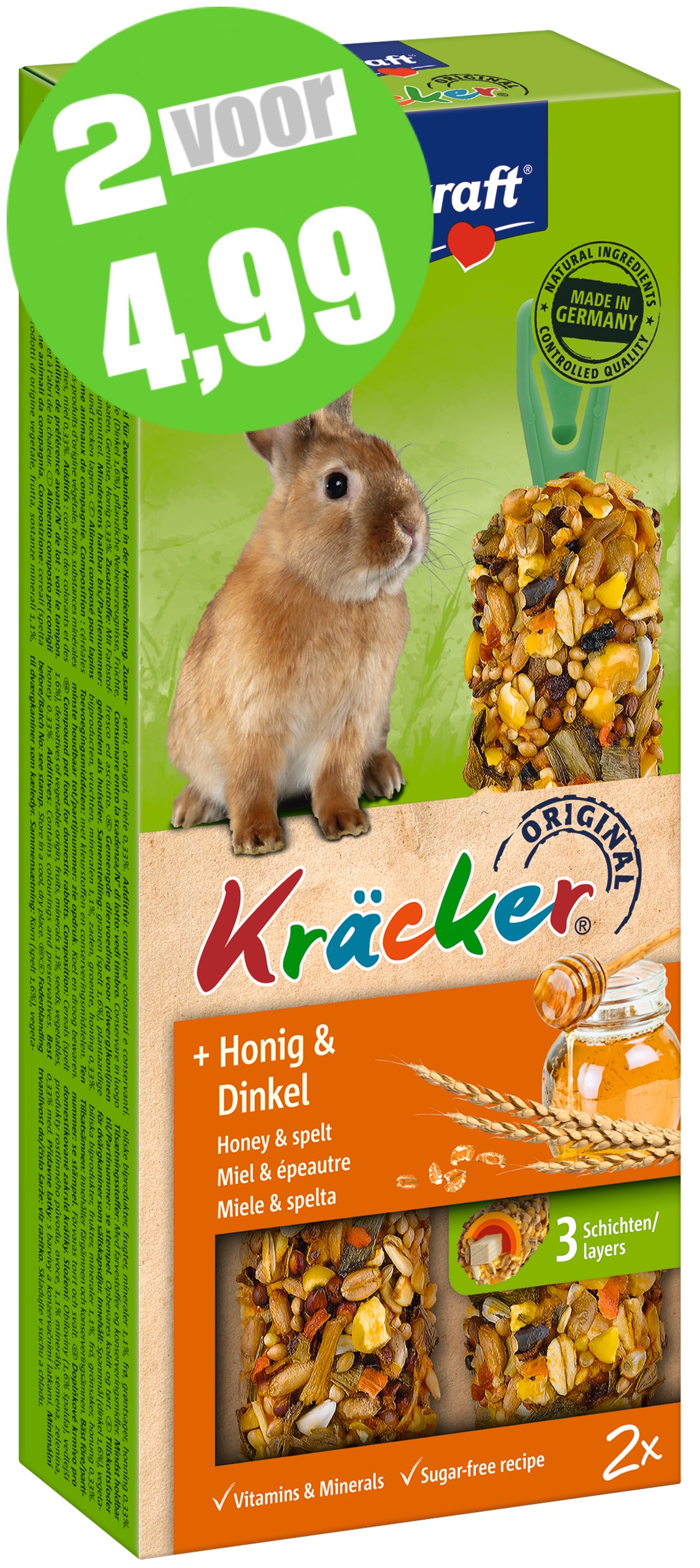 De orginele Vitakraft Kräckers zijn een verantwoorde lekkernij en bevatten lekkere granen, honing en spelt op een natuurlijk knabbelhoutje. De Kräckers zijn lekker van smaak en 3-voudig gebakken waardoor de ingrediënten stevig vastzitten en het konijn bezig wordt gehouden zoals dit in de vrije natuur ook gebeurt. Dit geeft het konijn de nodige beweging en zorgt ervoor dat hij zijn snijtanden op natuurlijke wijze kan afslijten. De Kräckers zijn afgestemd op de voedingsbehoefte van het konijn. Het Vital-Complex voorkomt gebreksverschijnselen en zorgt voor extra vitaliteit van het dier. Met waardevolle vitamines en bereid volgens een suikervrije receptuur.