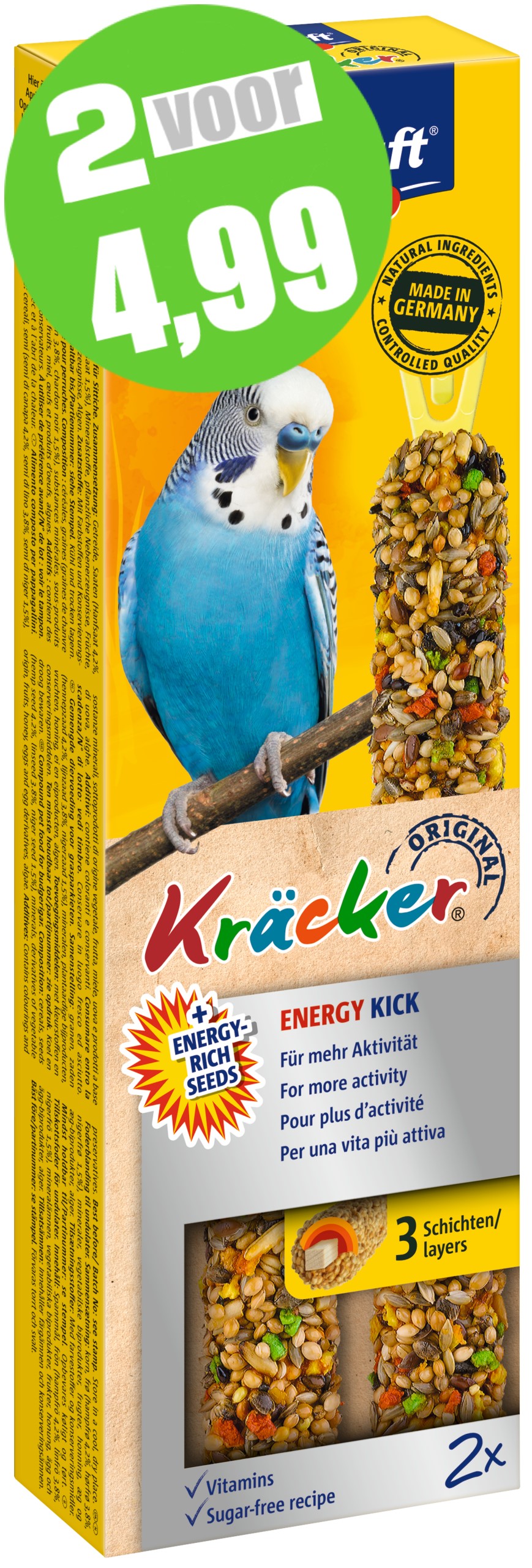 De functionele Vitakraft Kräckers zijn een verantwoorde lekkernij en bevatten lekkere zaden en granen op een natuurlijk knabbelhoutje. Deze functionele Kräcker bevat lijnzaad, hennepzaad en nigerzaad die rijk zijn aan energie voor meer activiteit van de parkiet. De Kräckers zijn lekker van smaak en 3-voudig gebakken waardoor de ingrediënten stevig vastzitten en de parkiet bezig wordt gehouden zoals dit in de vrije natuur ook gebeurt. Dit zorgt ervoor dat de snavel van de parkiet op natuurlijke wijze afslijt. De Kräckers zijn afgestemd op de voedingsbehoefte van de vogel. Het Vital-Complex voorkomt gebreksverschijnselen en zorgt voor extra vitaliteit van het dier. De Kräckers bevatten waardevolle vitamines, zijn bereid volgens een suikervrije receptuur en zijn gemakkelijk in de kooi op te hangen door de cliphouder aan de Kräcker.