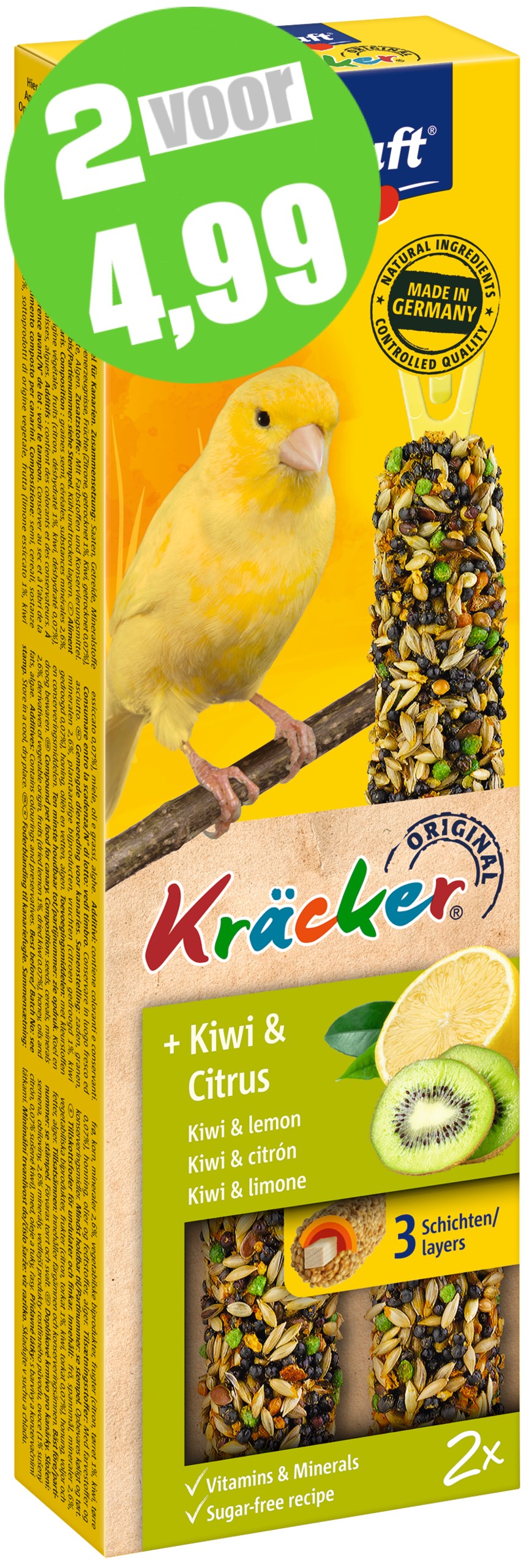 De originele Vitakraft Kräckers zijn een verantwoorde lekkernij en bevatten lekkere granen, zaden, kiwi en citrus op een natuurlijk knabbelhoutje. De Kräckers zijn lekker van smaak en 3-voudig gebakken waardoor de ingrediënten stevig vastzitten en de kanarie bezig wordt gehouden zoals dit in de vrije natuur ook gebeurt. Dit zorgt ervoor dat de snavel van de kanarie op natuurlijke wijze afslijt. De Kräckers zijn afgestemd op de voedingsbehoefte van de vogel. Het Vital-Complex voorkomt gebreksverschijnselen en zorgt voor extra vitaliteit van het dier. De Kräckers bevatten waardevolle vitamines, zijn bereid volgens een suikervrije receptuur en zijn gemakkelijk in de kooi op te hangen door de cliphouder aan de Kräcker.