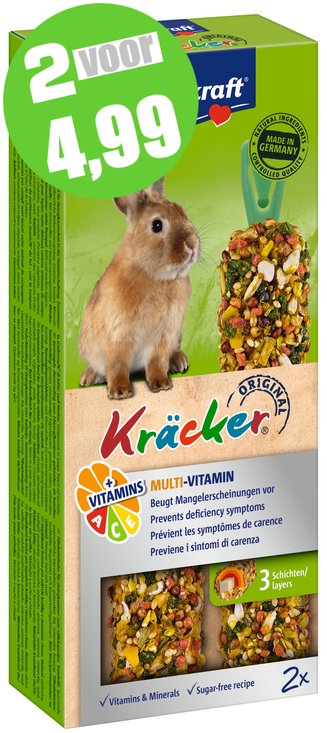 De functionele Vitakraft Kräckers zijn een verantwoorde lekkernij en bevatten lekkere granen op een natuurlijk knabbelhoutje. Deze functionele Kräcker bevat extra vitamine A, C en E die tekorten voorkomen en het immuunsysteem van het konijn ondersteunen. De Kräckers zijn lekker van smaak en 3-voudig gebakken waardoor de ingrediënten stevig vastzitten en het konijn bezig wordt gehouden zoals dit in de vrije natuur ook gebeurt. Dit geeft het konijn de nodige beweging en zorgt ervoor dat hij zijn snijtanden op natuurlijke wijze kan afslijten. De Kräckers zijn afgestemd op de voedingsbehoefte van het konijn. Het Vital-Complex voorkomt gebreksverschijnselen en zorgt voor extra vitaliteit van het dier. Met waardevolle vitamines en bereid volgens een suikervrije receptuur.