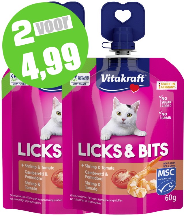 Vitakraft® LICKS & BITS combineert heerlijk genieten met fluweelzachte crème en zachte stukjes in een praktische knijpverpakking. Verkrijgbaar in twee onweerstaanbare smaken: Kaas & Ham en Garnaal & Tomaat – waar je kat dol op zal zijn.