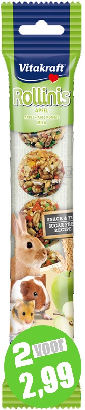 De Rollins met appel en granen zijn naast een verantwoorde snack een actief speeltje voor alle knaagdieren en konijnen. De Rollins zijn bedoeld om los op de bodem te leggen. Door de ronde vorm moet de bal rollen om ervan te kunnen eten. Rollins zijn een leuke en smaakvolle snack, bereid volgens een suikervrije receptuur. Zonder conserveringsmiddelen en Aroma Fresh verpakt zodat de Rollinis lekker knapperig blijven.