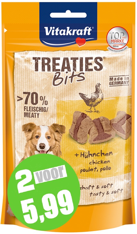 De Vitakraft Treaties Bits zijn onweerstaanbare vleeshapjes die gebakken zijn in de oven. Deze snack heeft een extra hoog vleesaandeel en is verkrijgbaar in de smaken leverworst en kip. Treaties Bits zijn volgens suikervrije receptuur bereid.