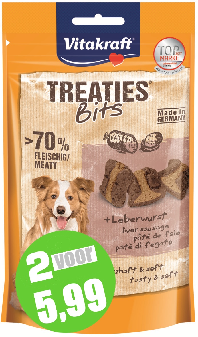 De Vitakraft Treaties Bits zijn onweerstaanbare vleeshapjes die gebakken zijn in de oven. Deze snack heeft een extra hoog vleesaandeel en is verkrijgbaar in de smaken leverworst en kip. Treaties Bits zijn volgens suikervrije receptuur bereid.