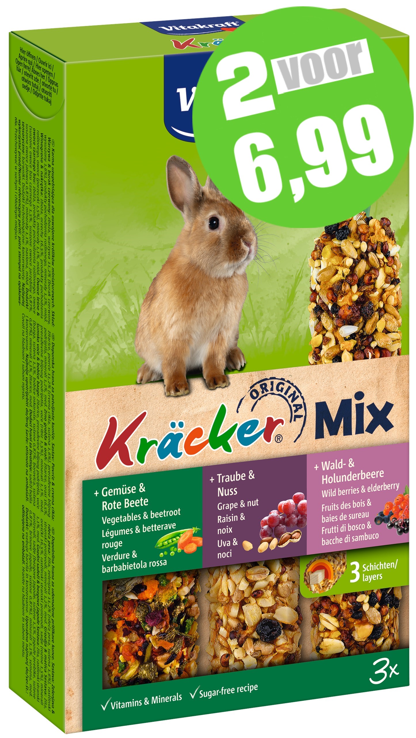 De orginele Vitakraft Trio Mix Kräckers zijn een verantwoorde lekkernij, 3 verschillende smaken Kräckers in de mix met lekkere granen, groente, noten en bosbessen op een natuurlijk knabbelhoutje. De Kräckers zijn lekker van smaak en 3-voudig gebakken waardoor de ingrediënten stevig vastzitten en het konijn bezig wordt gehouden zoals dit in de vrije natuur ook gebeurt. Dit geeft het konijn de nodige beweging en zorgt ervoor dat hij zijn snijtanden op natuurlijke wijze kan afslijten. De Kräckers zijn afgestemd op de voedingsbehoefte van het konijn. Het Vital-Complex voorkomt gebreksverschijnselen en zorgt voor extra vitaliteit van het dier. Met waardevolle vitamines en bereid volgens een suikervrije receptuur.
