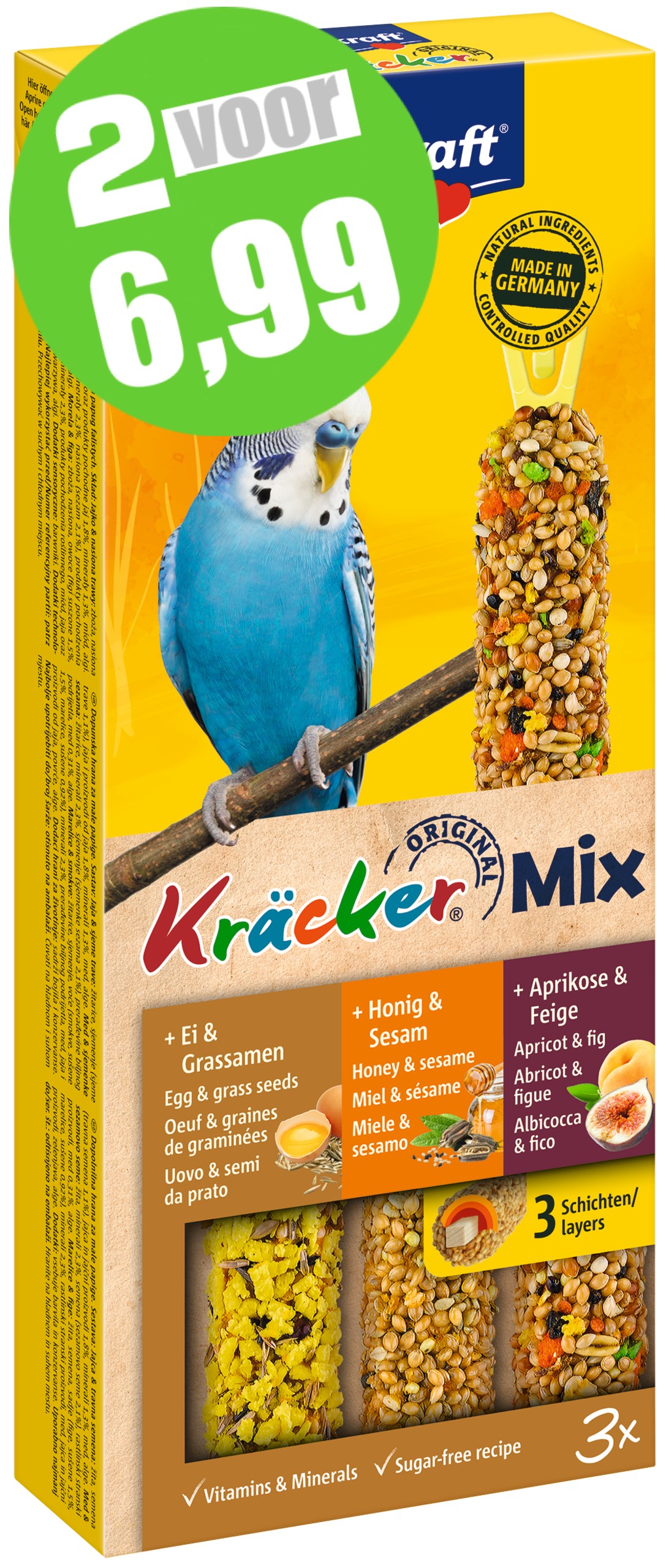 De originele Vitakraft Trio-Mix Kräckers zijn een verantwoorde lekkernij, 3 verschillende smaken Kräckers in de mix met lekkere ei, abrikoos en honing op een natuurlijk knabbelhoutje. De Kräckers zijn lekker van smaak en 3-voudig gebakken waardoor de ingrediënten stevig vastzitten en de parkiet bezig wordt gehouden zoals dit in de vrije natuur ook gebeurt. Dit zorgt ervoor dat de snavel van de parkiet op natuurlijke wijze afslijt. De Kräckers zijn afgestemd op de voedingsbehoefte van de vogel. Het Vital-Complex voorkomt gebreksverschijnselen en zorgt voor extra vitaliteit van het dier. De Kräckers bevatten waardevolle vitamines, zijn bereid volgens een suikervrije receptuur en zijn gemakkelijk in de kooi op te hangen door de cliphouder aan de Kräcker.