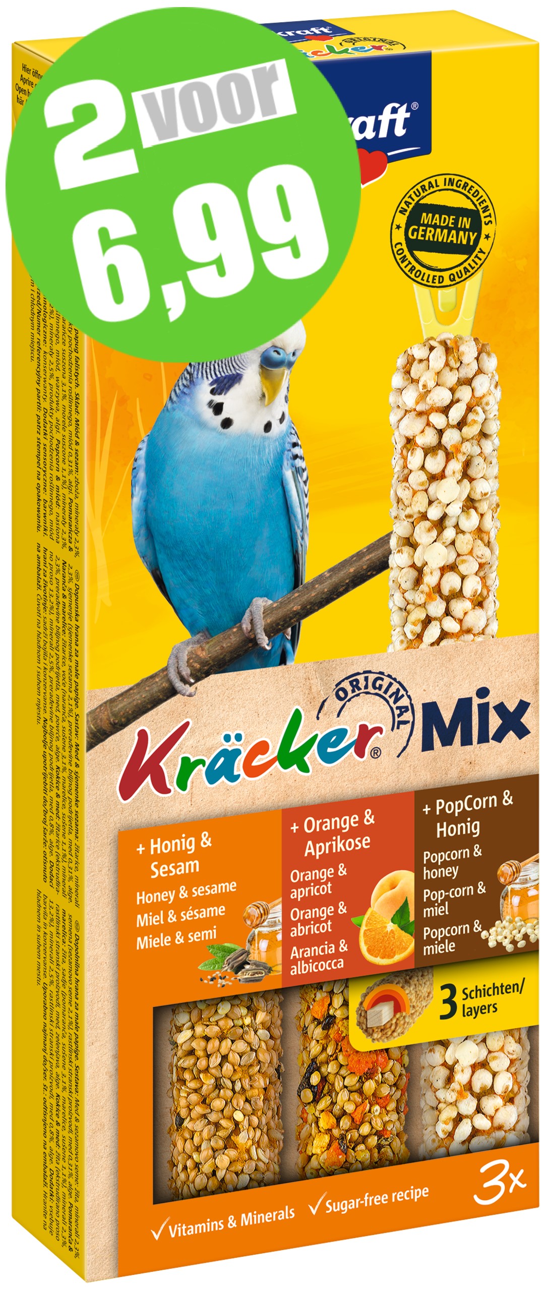 De originele Vitakraft Trio Mix Kräckers zijn een verantwoorde lekkernij, 3 verschillende smaken Kräckers in de mix met lekkere honing, sinaasappel en popcorn op een natuurlijk knabbelhoutje. De Kräckers zijn lekker van smaak en 3-voudig gebakken waardoor de ingrediënten stevig vastzitten en de parkiet bezig wordt gehouden zoals dit in de vrije natuur ook gebeurt. Dit zorgt ervoor dat de snavel van de parkiet op natuurlijke wijze afslijt. De Kräckers zijn afgestemd op de voedingsbehoefte van de vogel. Het Vital-Complex voorkomt gebreksverschijnselen en zorgt voor extra vitaliteit van het dier. De Kräckers bevatten waardevolle vitamines, zijn bereid volgens een suikervrije receptuur en zijn gemakkelijk in de kooi op te hangen door de cliphouder aan de Kräcker.