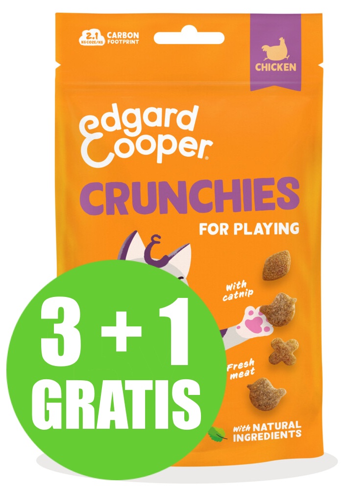 Onze Crunchies zijn gemaakt met lekker verse kip en natuurlijke ingrediënten - zonder toegevoegde suiker of granen. Ze bestaan in verschillende vormen die nieuwsgierige katten nog nieuwsgieriger maken. En dat vleugje kattenkruid maakt het extra spannend.