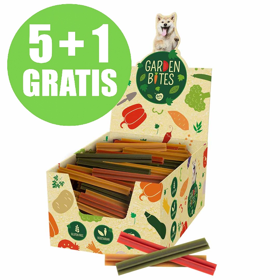 De vegetarische Garden Bites van duvoplus zijn een ideale beloning of tussendoortje voor jouw hond. In de Garden Bites zit maar liefst 55% zoete aardappel. Zoete aardappelen zijn een geweldige aanvulling op het dieet van je hond, ze zijn rijk aan oa. vitamines, calcium en ijzer. Door de speciale vorm wordt spelenderwijs het tandvlees gemasseerd en de tanden gereinigd. Het natuurlijke muntextract zorgt bovendien voor een frisse adem. De snacks zijn 100% glutenvrij waardoor ze licht verteerbaar zijn en zeer geschikt zijn voor honden met allergieën. De lekkere smaak maakt deze snacks compleet onweerstaanbaar!