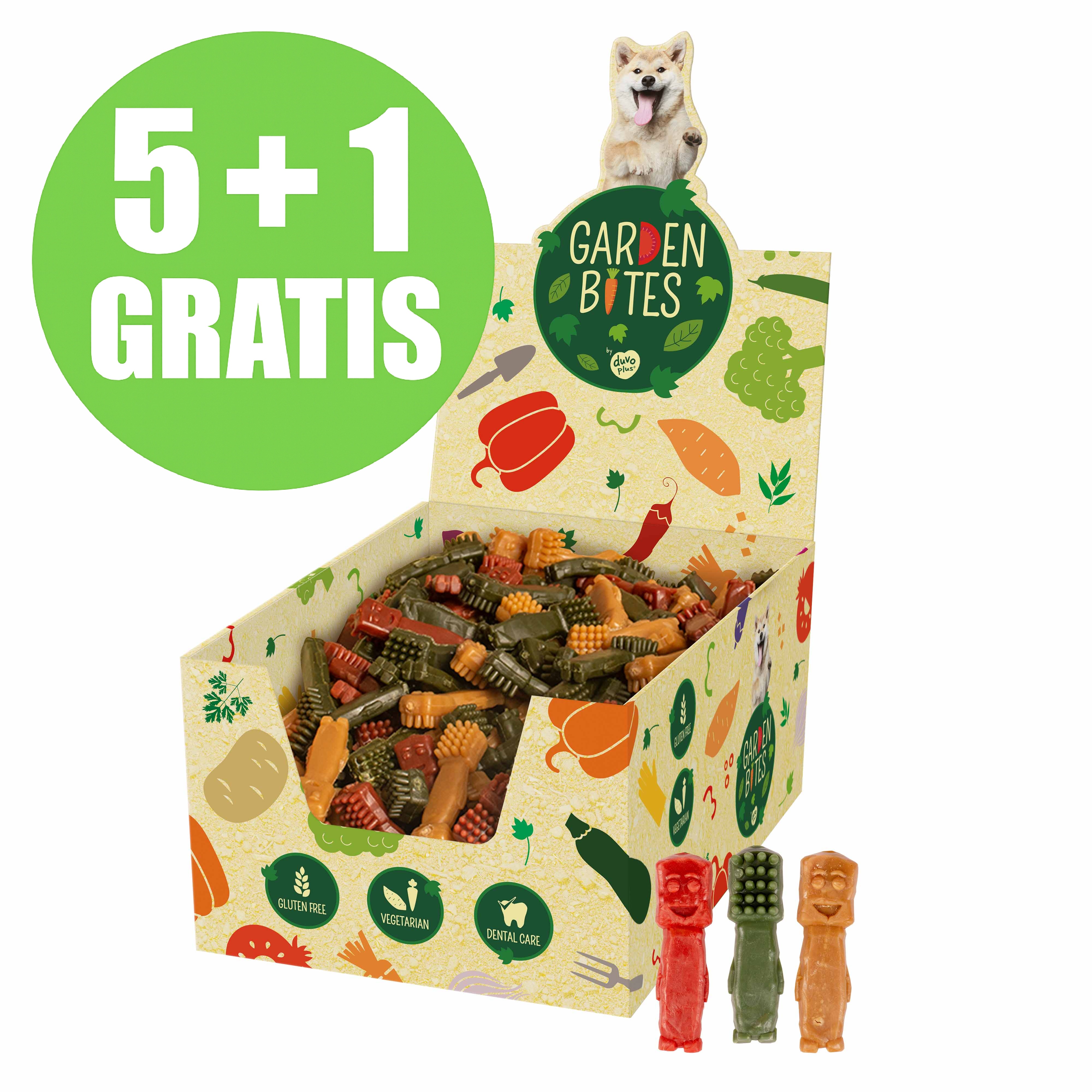 De vegetarische Garden Bites van duvoplus zijn een ideale beloning of tussendoortje voor jouw hond. In de Garden Bites zit maar liefst 55% zoete aardappel. Zoete aardappelen zijn een geweldige aanvulling op het dieet van je hond, ze zijn rijk aan oa. vitamines, calcium en ijzer. Door de speciale vorm wordt spelenderwijs het tandvlees gemasseerd en de tanden gereinigd. Het natuurlijke muntextract zorgt bovendien voor een frisse adem. De snacks zijn 100% glutenvrij waardoor ze licht verteerbaar zijn en zeer geschikt zijn voor honden met allergieën. De lekkere smaak maakt deze snacks compleet onweerstaanbaar!