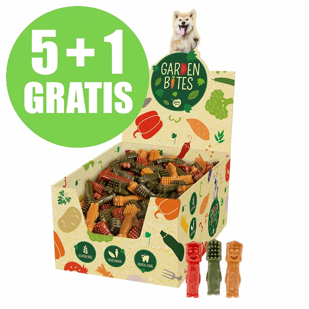 De vegetarische Garden Bites van duvoplus zijn een ideale beloning of tussendoortje voor jouw hond. In de Garden Bites zit maar liefst 55% zoete aardappel. Zoete aardappelen zijn een geweldige aanvulling op het dieet van je hond, ze zijn rijk aan oa. vitamines, calcium en ijzer. Door de speciale vorm wordt spelenderwijs het tandvlees gemasseerd en de tanden gereinigd. Het natuurlijke muntextract zorgt bovendien voor een frisse adem. De snacks zijn 100% glutenvrij waardoor ze licht verteerbaar zijn en zeer geschikt zijn voor honden met allergieën. De lekkere smaak maakt deze snacks compleet onweerstaanbaar!