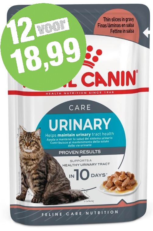Royal Canin Urinary Care in Gravy (brokjes in saus) is een complete en uitgebalanceerde voeding die speciaal is ontwikkeld om de urinewegen in optimale gezondheid te helpen houden. Urinary Care heeft bewezen resultaten. Uit een interne studie van Royal Canin blijkt dat deze voeding bijdraagt tot gezonde urinewegen na 10 dagen gebruik van het Urinary Care-voedingsprogramma (combinatie van droogvoeding en natvoeding). Urinary Care is ook verkrijgbaar in de vorm van brokjes in gelei of droogvoeding (brokken). Door natvoeding en droogvoeding te combineren, bied je je kat de variatie waar ze zo van houdt.