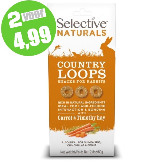 De SSS Naturals Country Loops Rabbit zijn natuurlijke snacks die speciaal zijn ontwikkeld voor konijnen. Deze smakelijke loops zijn ideaal als verantwoord tussendoortje of beloning en sluiten aan bij het natuurlijke voedingspatroon van konijnen.