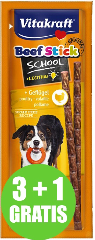 De Beef Stick School bevat tien extra dunne sticks voor het trainen van honden. Verrijkt met lecithine voor optimale ondersteuning van de concentratie van de hond.