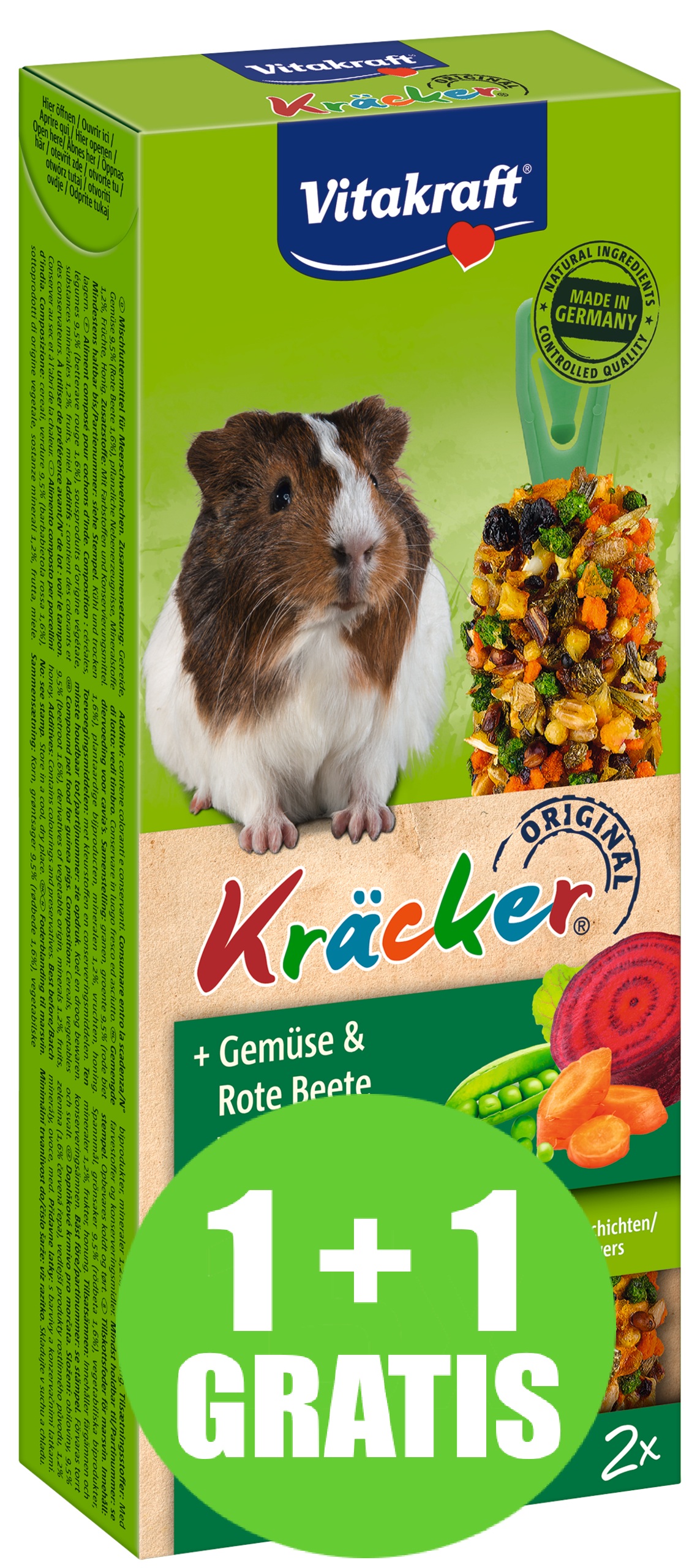 De orginele Vitakraft Kräckers zijn een verantwoorde lekkernij en bevatten lekkere granen, groente en bieten op een natuurlijk knabbelhoutje. De Kräckers zijn lekker van smaak en 3-voudig gebakken waardoor de ingrediënten stevig vastzitten en de cavia bezig wordt gehouden zoals dit in de vrije natuur ook gebeurt. Dit geeft de cavia de nodige beweging en zorgt ervoor dat hij zijn tanden op natuurlijke wijze kan afslijten. De Kräckers zijn afgestemd op de voedingsbehoefte van de cavia. Het Vital-Complex voorkomt gebreksverschijnselen en zorgt voor extra vitaliteit van het dier. Met waardevolle vitamines, extra vitamine C en bereid volgens een suikervrije receptuur.