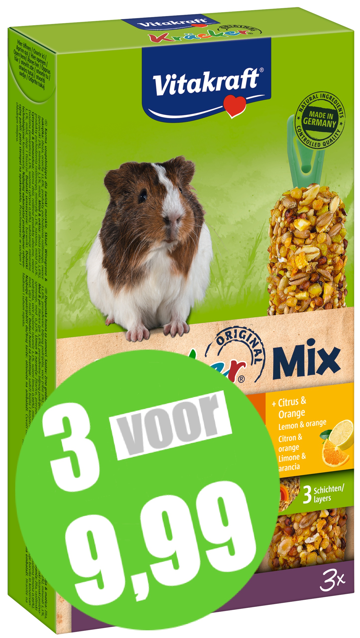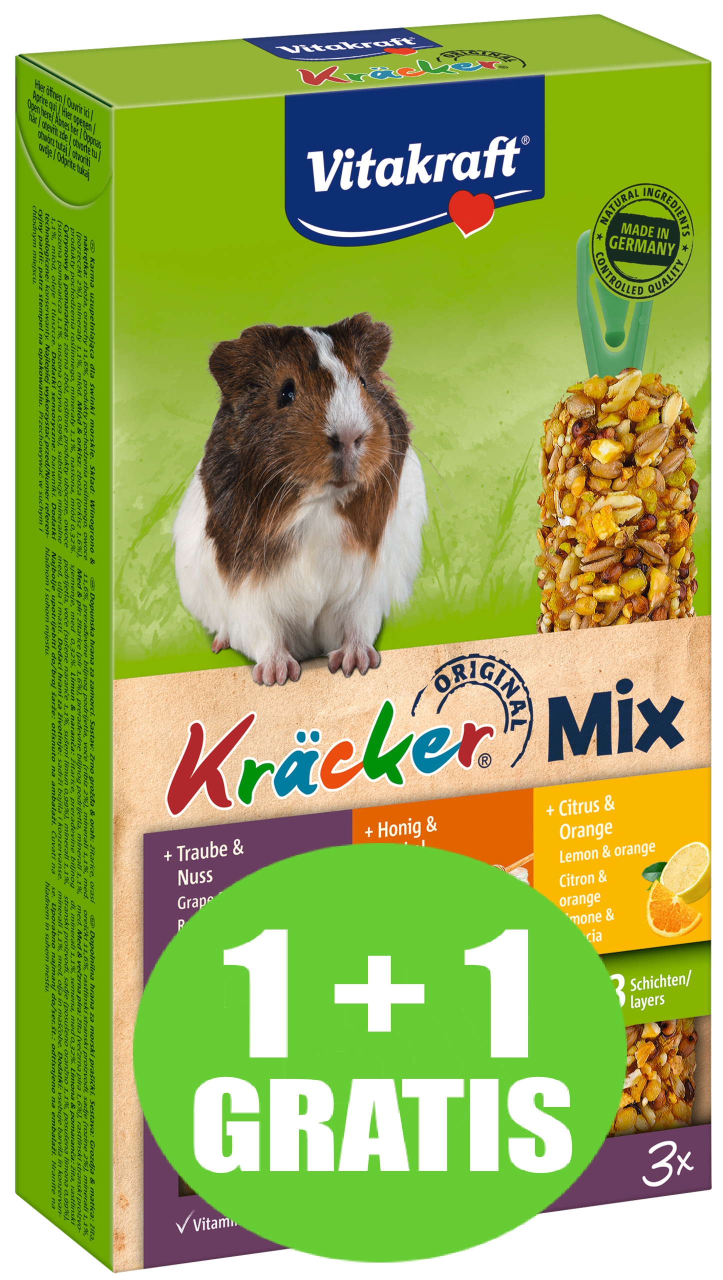 De orginele Vitakraft Trio Mix Kräckers zijn een verantwoorde lekkernij, 3 verschillende smaken Kräckers in de mix met lekkere granen, druiven, honing en citrus op een natuurlijk knabbelhoutje. De Kräckers zijn lekker van smaak en 3-voudig gebakken waardoor de ingrediënten stevig vastzitten en de cavia bezig wordt gehouden zoals dit in de vrije natuur ook gebeurt. Dit geeft de cavia de nodige beweging en zorgt ervoor dat hij zijn snijtanden op natuurlijke wijze kan afslijten. De Kräckers zijn afgestemd op de voedingsbehoefte van de cavia. Het Vital-Complex voorkomt gebreksverschijnselen en zorgt voor extra vitaliteit van het dier. Met waardevolle vitamines, extra vitamine C en bereid volgens een suikervrije receptuur.