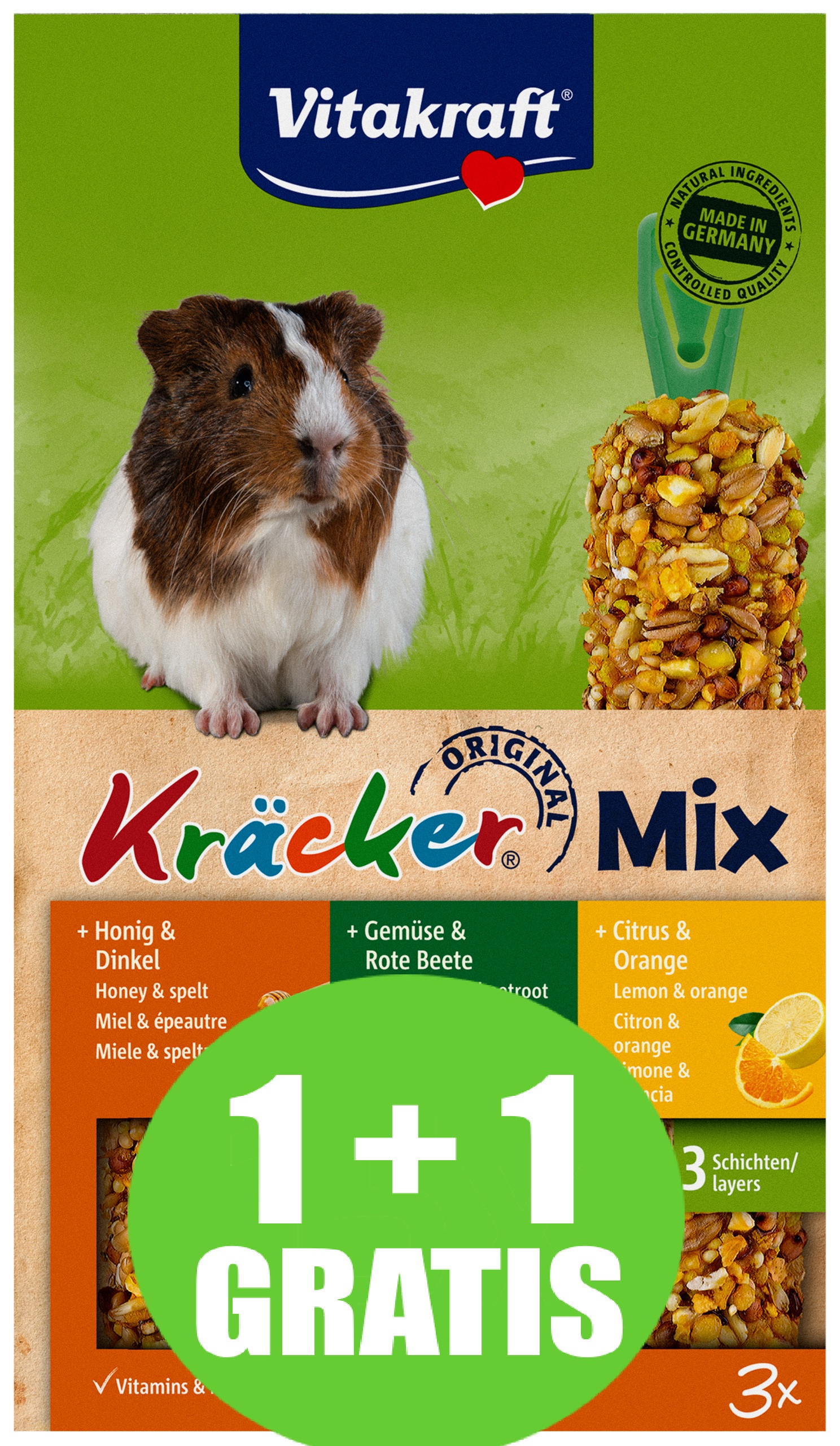 De orginele Vitakraft Trio Mix Kräckers zijn een verantwoorde lekkernij, 3 verschillende smaken Kräckers in de mix met lekkere granen, citrus, groente en honing op een natuurlijk knabbelhoutje. De Kräckers zijn lekker van smaak en 3-voudig gebakken waardoor de ingrediënten stevig vastzitten en de cavia bezig wordt gehouden zoals dit in de vrije natuur ook gebeurt. Dit geeft de cavia de nodige beweging en zorgt ervoor dat hij zijn snijtanden op natuurlijke wijze kan afslijten. De Kräckers zijn afgestemd op de voedingsbehoefte van de cavia. Het Vital-Complex voorkomt gebreksverschijnselen en zorgt voor extra vitaliteit van het dier. Met waardevolle vitamines, extra vitamine C en bereid volgens een suikervrije receptuur.