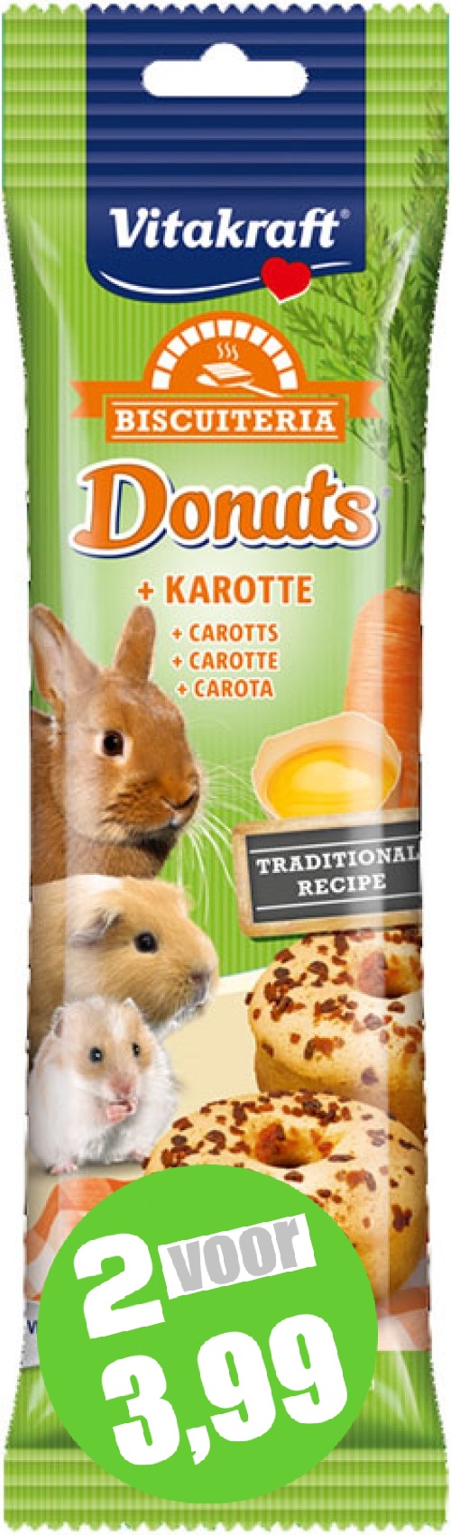 Lekkere biscuitsnack uit eigen bakkerij met smakelijke wortel. De lekkernij is bereid volgens traditioneel recept en bevat voedzame ingrediënten zoals eieren en meel. Een heerlijk tussendoortje voor alle knaagdieren en konijnen. Zonder kunstmatige kleurstoffen, aroma’s en conserveringsmiddelen. 4 Donuts per verpakking en Aroma Fresh verpakt zodat de Donuts lekker knapperig blijven.