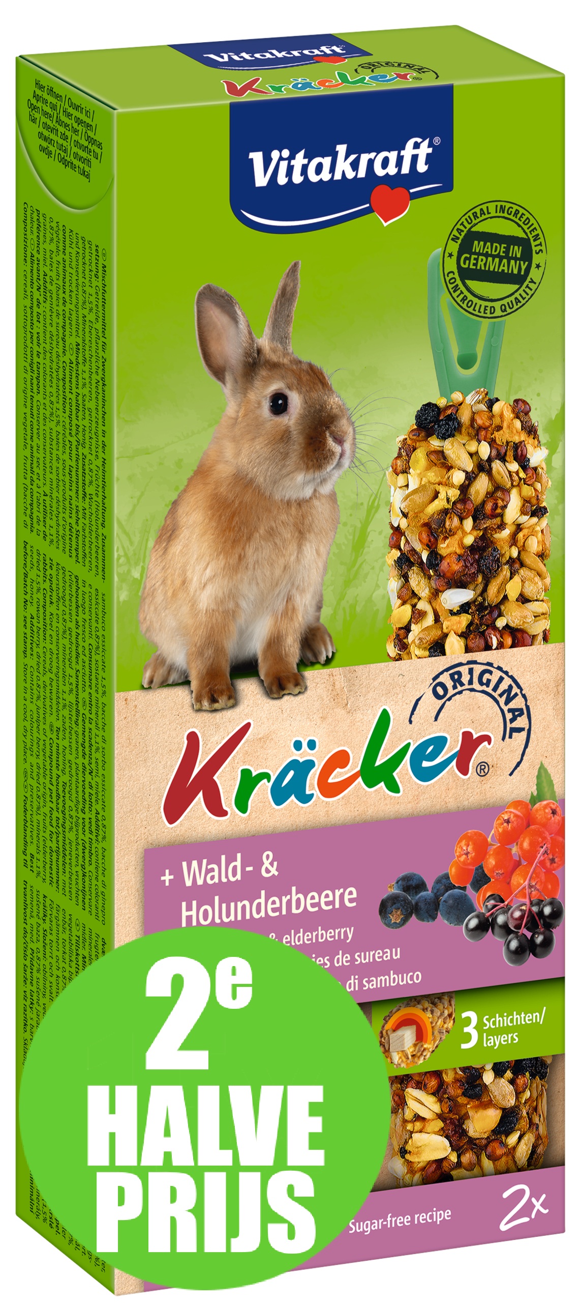 De orginele Vitakraft Kräckers zijn een verantwoorde lekkernij en bevatten lekkere granen, bosbessen en vlierbessen op een natuurlijk knabbelhoutje. De Kräckers zijn lekker van smaak en 3-voudig gebakken waardoor de ingrediënten stevig vastzitten en het konijn bezig wordt gehouden zoals dit in de vrije natuur ook gebeurt. Dit geeft het konijn de nodige beweging en zorgt ervoor dat hij zijn snijtanden op natuurlijke wijze kan afslijten. De Kräckers zijn afgestemd op de voedingsbehoefte van het konijn. Het Vital-Complex voorkomt gebreksverschijnselen en zorgt voor extra vitaliteit van het dier. Met waardevolle vitamines en bereid volgens een suikervrije receptuur.