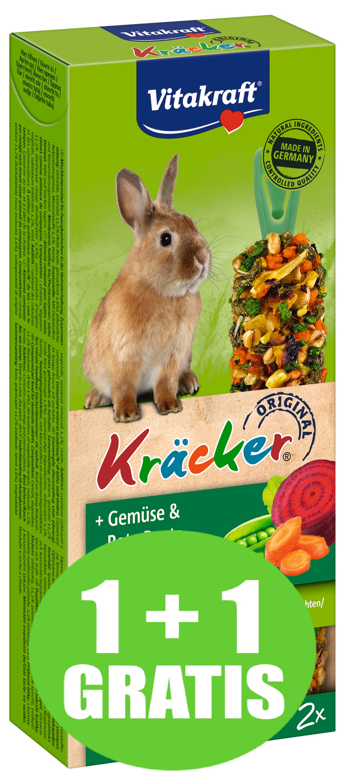 De orginele Vitakraft Kräckers zijn een verantwoorde lekkernij en bevatten lekkere granen, groente en bieten op een natuurlijk knabbelhoutje. De Kräckers zijn lekker van smaak en 3-voudig gebakken waardoor de ingrediënten stevig vastzitten en het konijn bezig wordt gehouden zoals dit in de vrije natuur ook gebeurt. Dit geeft het konijn de nodige beweging en zorgt ervoor dat hij zijn snijtanden op natuurlijke wijze kan afslijten. De Kräckers zijn afgestemd op de voedingsbehoefte van het konijn. Het Vital-Complex voorkomt gebreksverschijnselen en zorgt voor extra vitaliteit van het dier. Met waardevolle vitamines en bereid volgens een suikervrije receptuur.