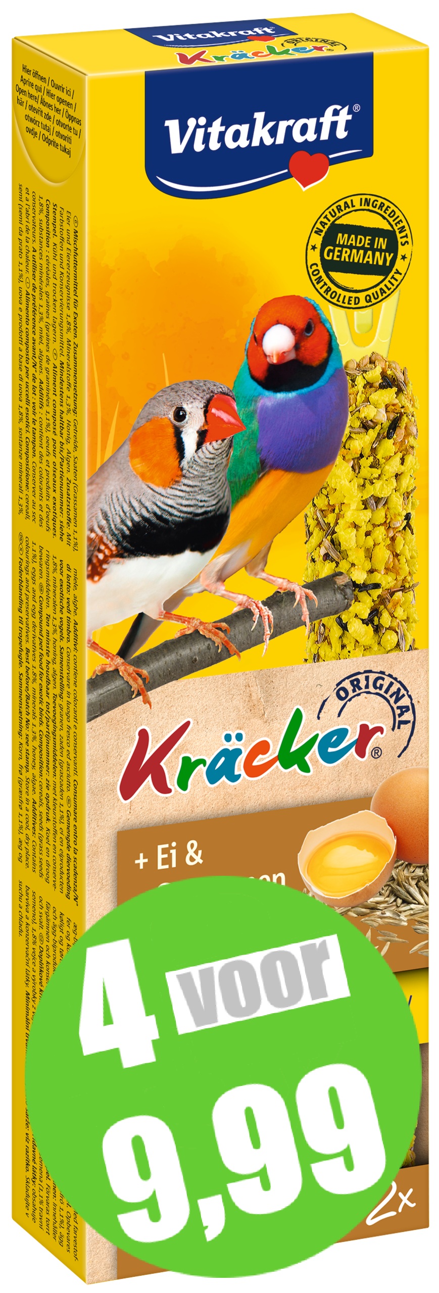 De originele Vitakraft Kräckers zijn een verantwoorde lekkernij en bevatten lekkere zaden, granen, graszaden en ei op een natuurlijk knabbelhoutje. De Kräckers zijn lekker van smaak en 3-voudig gebakken waardoor de ingrediënten stevig vastzitten en de exotische vogel bezig wordt gehouden zoals dit in de vrije natuur ook gebeurt. Dit zorgt ervoor dat de snavel van de exoot op natuurlijke wijze afslijt. De Kräckers zijn afgestemd op de voedingsbehoefte van de exotische vogel. Het Vital-Complex voorkomt gebreksverschijnselen en zorgt voor extra vitaliteit van het dier. De Kräckers bevatten waardevolle vitamines, zijn bereid volgens een suikervrije receptuur en zijn gemakkelijk in de kooi op te hangen door de cliphouder aan de Kräcker.