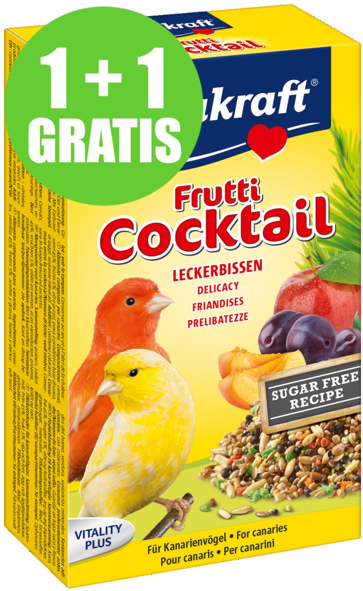 Frutti Cocktail voor de kanarie is een heerlijke traktatie en verwennerij. De knabbelmix is niet alleen lekker maar bevat ook waardevolle vitamines en voedingsstoffen. De Frutti Cocktail voegt variatie toe aan het dagelijkse rantsoen van de kanarie en bestaat uit lekkere vruchten zoals appel, pruim en abrikoos en zongerijpte zaden welke een goede, gezonde energiebron zijn. De geselecteerde ingrediënten maken de Fruit cocktail een smakelijke voeding, ter aanvulling van de hoofdvoeding. De Frutti Cocktail is bereid volgens een suikervrije receptuur en zonder kunstmatige smaakversterkers en conserveringsmiddelen.