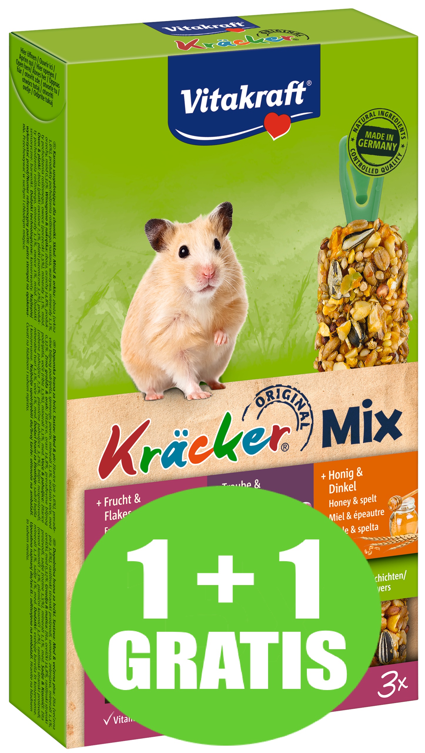 De orginele Vitakraft Trio Mix Kräckers zijn een verantwoorde lekkernij, 3 verschillende smaken Kräckers in de mix met lekkere granen, honing, noten en fruit op een natuurlijk knabbelhoutje. De Kräckers zijn lekker van smaak en 3-voudig gebakken waardoor de ingrediënten stevig vastzitten en de hamster bezig wordt gehouden zoals dit in de vrije natuur ook gebeurt. Dit geeft de hamster de nodige beweging en zorgt ervoor dat hij zijn snijtanden op natuurlijke wijze kan afslijten. De Kräckers zijn afgestemd op de voedingsbehoefte van de hamster. Het Vital-Complex voorkomt gebreksverschijnselen en zorgt voor extra vitaliteit van het dier. Met waardevolle vitamines, extra vitamine C en bereid volgens een suikervrije receptuur.