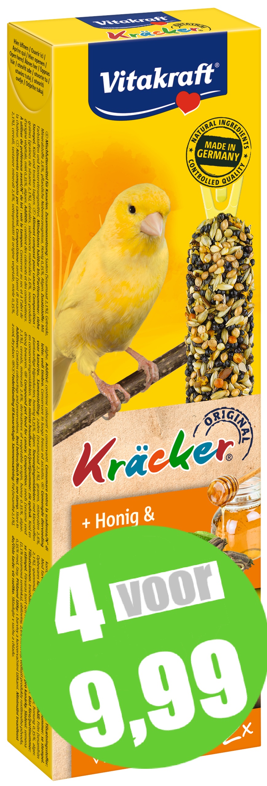 De originele Vitakraft Kräckers zijn een verantwoorde lekkernij en bevatten lekkere granen, zaden, honing en sesam op een natuurlijk knabbelhoutje. De Kräckers zijn lekker van smaak en 3-voudig gebakken waardoor de ingrediënten stevig vastzitten en de kanarie bezig wordt gehouden zoals dit in de vrije natuur ook gebeurt. Dit zorgt ervoor dat de snavel van de kanarie op natuurlijke wijze afslijt. De Kräckers zijn afgestemd op de voedingsbehoefte van de vogel. Het Vital-Complex voorkomt gebreksverschijnselen en zorgt voor extra vitaliteit van het dier. De Kräckers bevatten waardevolle vitamines, zijn bereid volgens een suikervrije receptuur en zijn gemakkelijk in de kooi op te hangen door de cliphouder aan de Kräcker.
