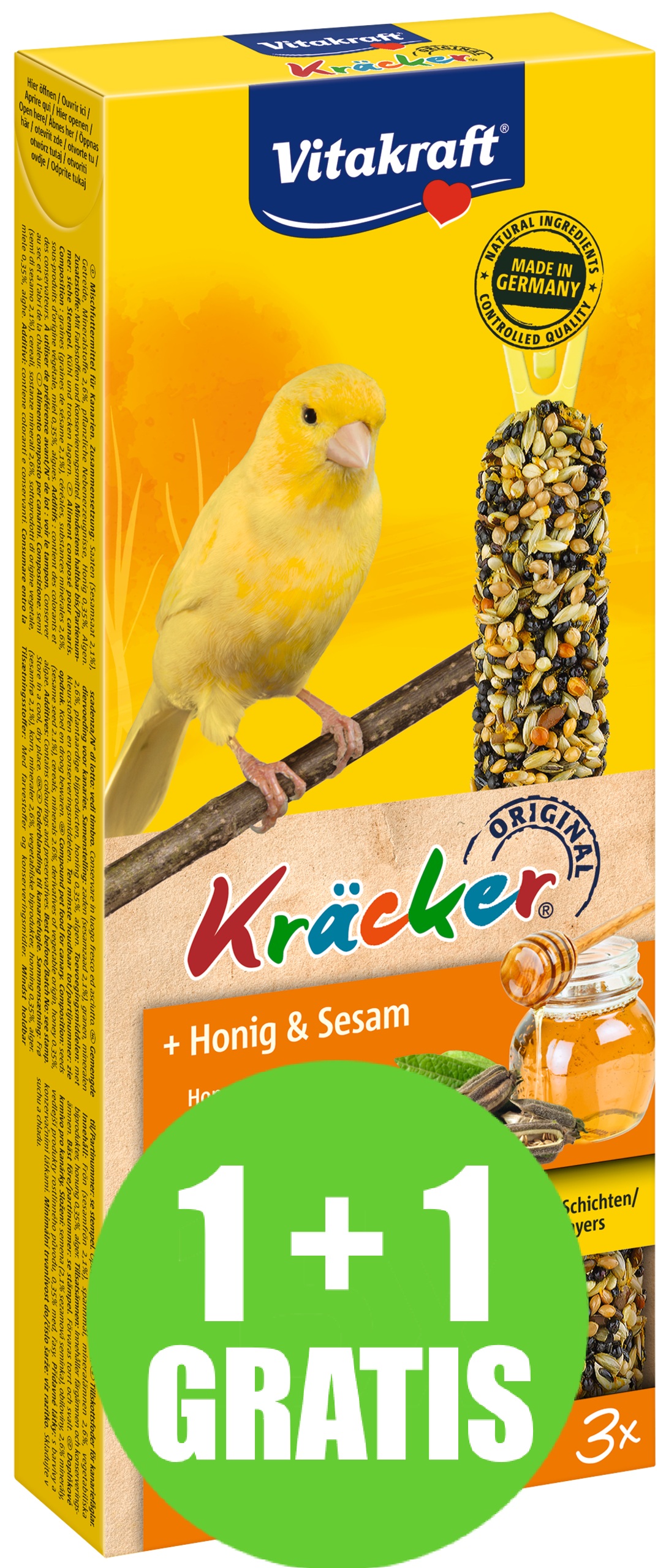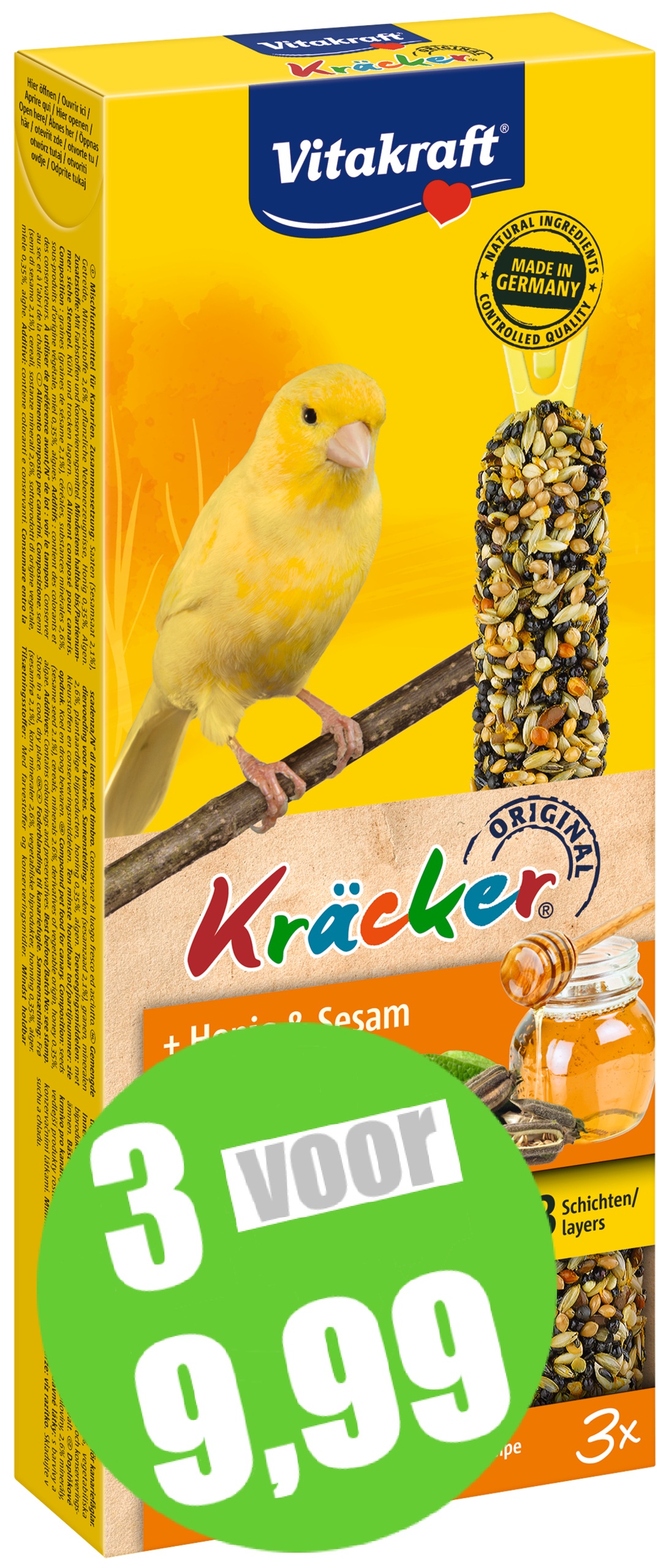 De originele Vitakraft Trio Kräckers zijn een verantwoorde lekkernij en bevatten 3 heerlijke Kräckers met granen, zaden, sesam en honing op een natuurlijk knabbelhoutje. De Kräckers zijn lekker van smaak en 3-voudig gebakken waardoor de ingrediënten stevig vastzitten en de kanarie bezig wordt gehouden zoals dit in de vrije natuur ook gebeurt. Dit zorgt ervoor dat de snavel van de kanarie op natuurlijke wijze afslijt. De Kräckers zijn afgestemd op de voedingsbehoefte van de vogel. Het Vital-Complex voorkomt gebreksverschijnselen en zorgt voor extra vitaliteit van het dier. de Kräckers bevatten waardevolle vitamines, zijn bereid volgens een suikervrije receptuur en zijn gemakkelijk in de kooi op te hangen door de cliphouder aan de Kräcker.