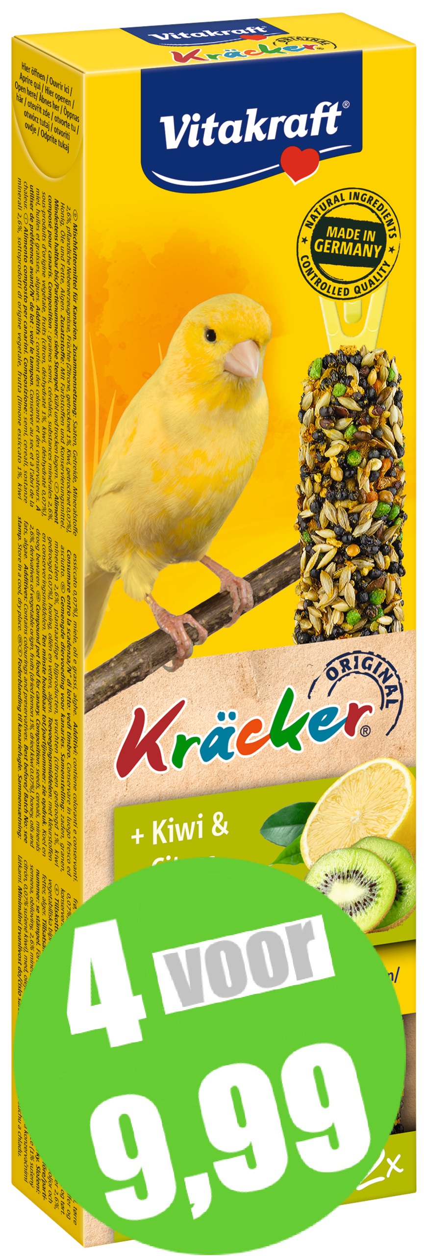 De originele Vitakraft Kräckers zijn een verantwoorde lekkernij en bevatten lekkere granen, zaden, kiwi en citrus op een natuurlijk knabbelhoutje. De Kräckers zijn lekker van smaak en 3-voudig gebakken waardoor de ingrediënten stevig vastzitten en de kanarie bezig wordt gehouden zoals dit in de vrije natuur ook gebeurt. Dit zorgt ervoor dat de snavel van de kanarie op natuurlijke wijze afslijt. De Kräckers zijn afgestemd op de voedingsbehoefte van de vogel. Het Vital-Complex voorkomt gebreksverschijnselen en zorgt voor extra vitaliteit van het dier. De Kräckers bevatten waardevolle vitamines, zijn bereid volgens een suikervrije receptuur en zijn gemakkelijk in de kooi op te hangen door de cliphouder aan de Kräcker.