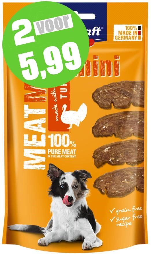 MEAT ME! mini. Heerlijk gedroogde mini kalkoenreepjes van hoge kwaliteit met een onweerstaanbare smaak. De mini kalkoenreepjes zijn zorgvuldig gedroogd en worden regionaal in Duitsland geproduceerd. Deze hondensnack van puur vlees is heerlijk genieten voor elke hond. De MEAT ME hondensnacks bevatten geen granen en zijn bereid volgens een suikervrije receptuur. De verpakking is hersluitbaar zodat de mini kalkoenreepjes heerlijk vers blijven. De MEAT ME mini zijn ideaal voor kleine honden.