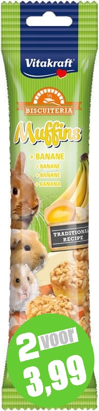 Heb jij een hamster, cavia, konijn of een ander lief knaagdier? En wil jij je zachte huisdier verwennen met een heerlijk tussendoortje? Verras dan eens met de Vitakraft muffins! Deze lekkere snacks zijn volgens traditioneel recept bereid en gemaakt in onze eigen bakkerij. Deze muffins voor knaagdieren zijn onweerstaanbaar lekker en zullen ongetwijfeld in de smaak vallen. Niet alleen is deze snack erg lekker, deze snacks zijn ook nog eens afgestemd op de behoefte van jouw knaagdier. Zo bevat de snack voedzame ingrediënten zoals eieren en meel. Dankzij de toevoeging van banaan wordt het gegarandeerd smullen.