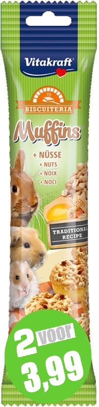 Wil jij je lieve konijn, hamster, cavia of ander knaagdier eens goed verwennen? Gewoonweg omdat je zo gek bent op je zachte huisdier? Probeer dan eens de Vitakraft muffins! Deze onweerstaanbare snacks zijn gemaakt in ons eigen bakkerij én bereid volgens een oud, traditioneel recept. De snack bevat heerlijke noten voor een onweerstaanbare smaak. Je huisdier zal deze lekkere muffins niet kunnen weerstaan! Bovendien bevat deze snack voedzame ingrediënten zoals eieren en meel. Zeer geschikt als tussendoortje dus!