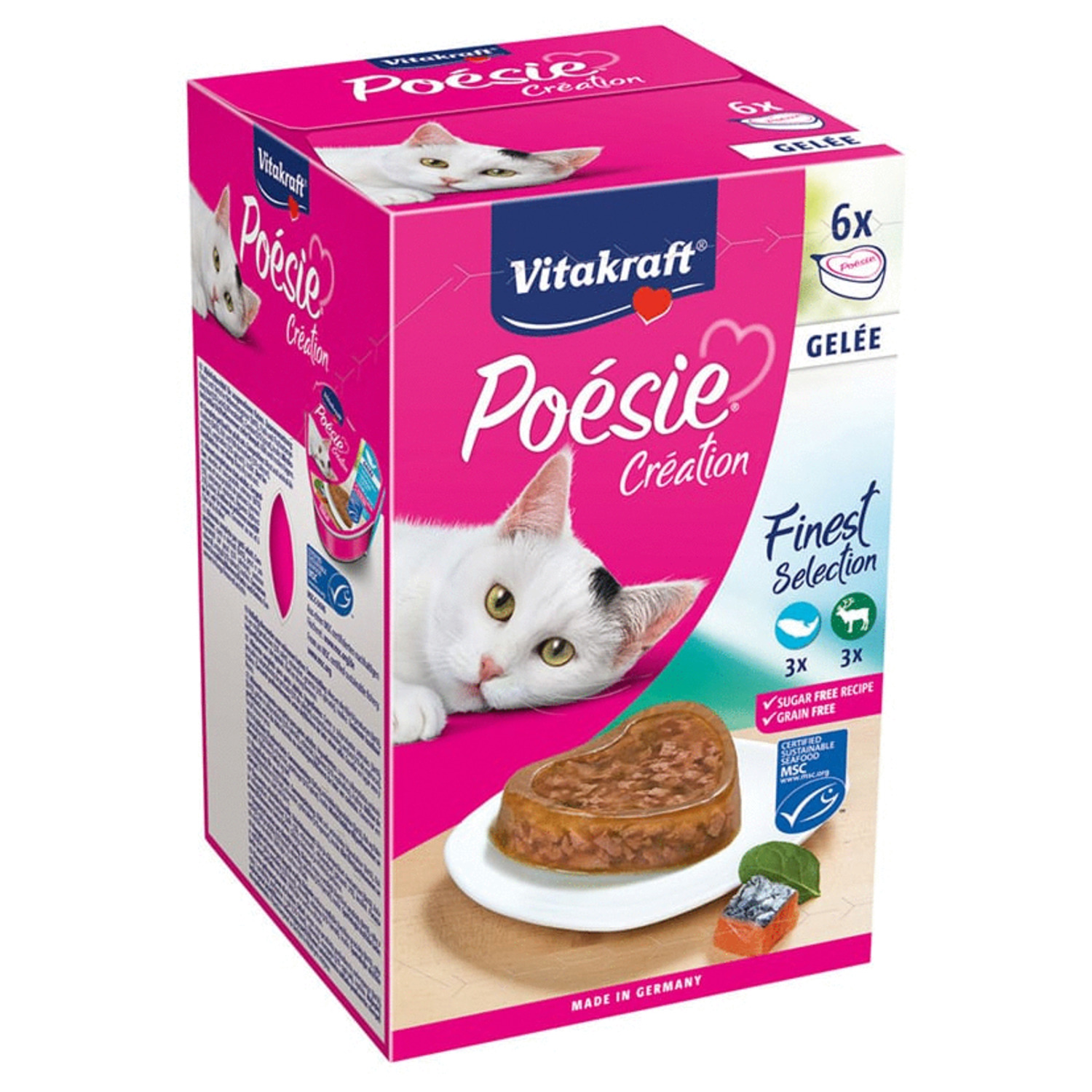 Multipack Poésie met de smaken zalm & spinazie in gelei en wild in cranberry-gelei. Elke schaal Poésie bevat een onweerstaanbare smaak en heerlijke verse ingrediënten. Deze volledige natvoeding is geheel op de voedingsbehoeften van volwassen katten afgestemd en is van de hoogste kwaliteit. Poésie wordt volgens een suikervrije receptuur bereid en bevat geen kunstmatige kleurstoffen en conserveringsmiddelen.