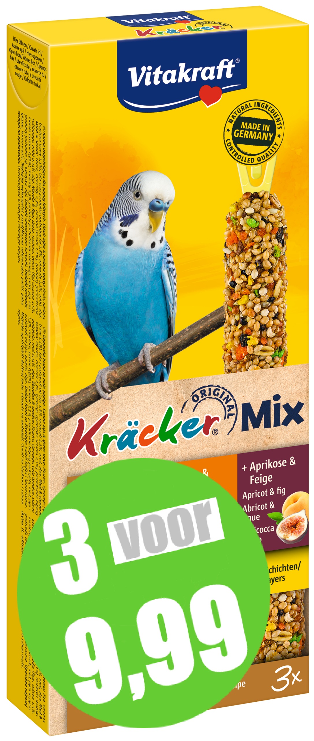 De originele Vitakraft Trio-Mix Kräckers zijn een verantwoorde lekkernij, 3 verschillende smaken Kräckers in de mix met lekkere ei, abrikoos en honing op een natuurlijk knabbelhoutje. De Kräckers zijn lekker van smaak en 3-voudig gebakken waardoor de ingrediënten stevig vastzitten en de parkiet bezig wordt gehouden zoals dit in de vrije natuur ook gebeurt. Dit zorgt ervoor dat de snavel van de parkiet op natuurlijke wijze afslijt. De Kräckers zijn afgestemd op de voedingsbehoefte van de vogel. Het Vital-Complex voorkomt gebreksverschijnselen en zorgt voor extra vitaliteit van het dier. De Kräckers bevatten waardevolle vitamines, zijn bereid volgens een suikervrije receptuur en zijn gemakkelijk in de kooi op te hangen door de cliphouder aan de Kräcker.