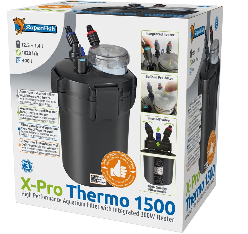 De SuperFish X Pro Thermo 1500 is een krachtig buitenfilter met een grote biologische filtercapaciteit en ingebouwde verwarming. Het filter wordt compleet geleverd inclusief filtermedia, slangen, buizen, en aansluitmaterialen én oppervlakte afzuiger (skimmer). De X Pro is makkelijk schoon te maken door het handige voorfilter en de all-in-one afsluiter met roteerbare slangaansluiting. De filterslangen zijn 360 graden draaibaar wat de plaatsing van de filter vergemakkelijkt.