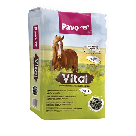 Pavo Vital is een dagelijkse balancer: een melasse- en graanvrij brokje met alle vitaminen en mineralen die je paard nodig heeft, gemaakt van 100% natuurlijke grondstoffen en zónder overbodige toevoegingen. Het unieke aan Pavo Vital is de toevoeging van de nieuwste generatie sporenelementen Intellibond®. Deze speciale mix zorgt er namelijk voor dat de van nature vieze smaak van koper en zink pas in de maag vrijkomt in plaats van in de mond. Hierdoor proeft je paard er dus niets van en worden de altijd lastige sporenelementen zeer goed opgenomen. Samen met de toevoeging van timothee en luzerne resulteert dat in een zeer smakelijk brokje!