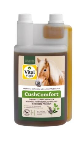 Vitalstyle CushComfort 1 liter biedt gerichte ondersteuning aan paarden met een verstoorde hormoonhuishouding, zoals bij PPID (ziekte van Cushing, hormonale aandoening bij oudere paarden).