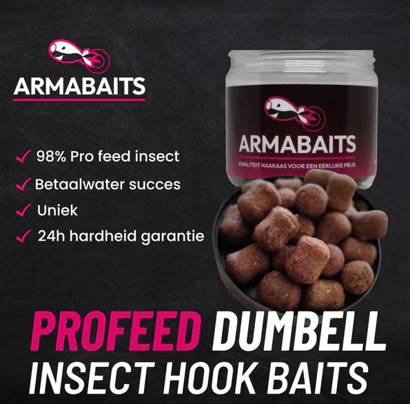 Voor deze haakaasjes heeft Armabaits 98% pure Carp Pro feed Insect pellets als basis voor deze dumbells gebruikt. Die andere 2% is een uitgekiende combinatie van hardmakers en binders om de boel zeker 24 uur stabiel te houden.