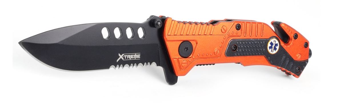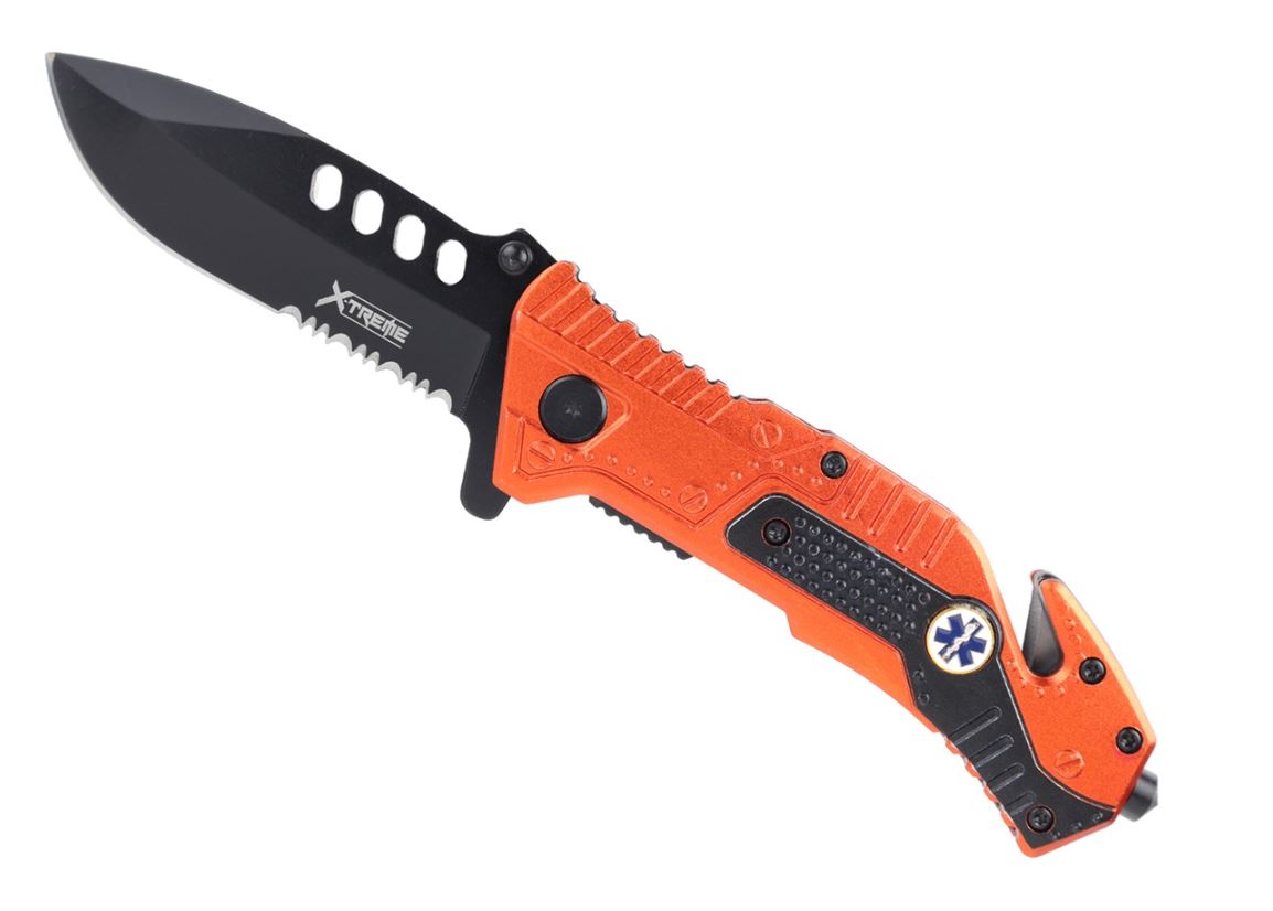 De X-Treme Survivor Rescue is een modern en veelzijdig rescuemes dat je in iedere situatie de juiste oplossing kan bieden. De Rescue is eenvoudig één handig open te klappen door middel van zijn duimstud of flipper. De snede is half gekartelde waardoor dit mes uitermate geschikt is voor zwaardere taken zoals het doorsnijden van vezel houdend materiaal. Het CNC gefreesde geanodiseerd aluminium heft is voorzien van een aantrekkelijk patroon die het mes een unieke uitstraling geeft. Aluminium is lichtgewicht, heeft een verfijnde uitstraling en een goede slijtvastheid. Aan de achterzijde van dit mes vindt je een gordelsnijder en een glasbreker, essentiële uitrusting in een reddingsmes. De Survivor beschikt over een draagclip.