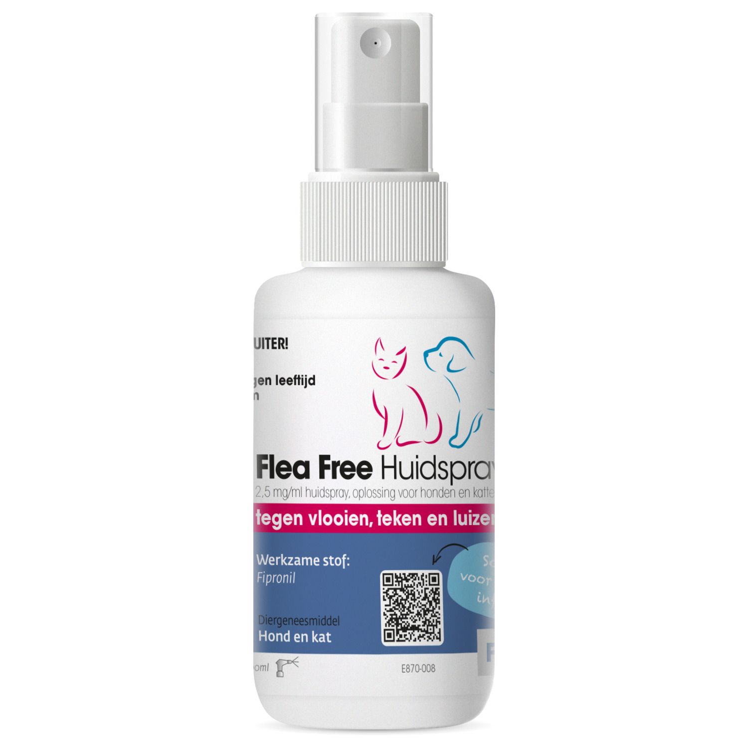 Flea Free Huidspray is een diergeneesmiddel voor honden en katten. Puppy’s & kittens vanaf 2 dagen oud kunnen veilig worden behandeld. De huidspray is te gebruiken bij de behandeling van vlooien, teken en bijtende luizen.
