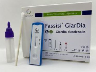 Sneltest voor de detectie van Giardia in uitwerpselen van honden en katten. De verpakking is verzendklaar (in brievenbusverpakking) en kan direct worden voorzien van adressticker en frankering. Fassisi Giardia sneltest is een snelle immunochromatografische test die oppervlakte-antigenen van Giardia-cysten en trofozoïeten detecteert.* Als er een infectie met Giardia aanwezig is, is onmiddellijke behandeling belangrijk en moet de huisdiereigenaar ook onmiddellijk hygiënische maatregelen nemen in het eigen huishouden om de bijzonder hardnekkige ziekteverwekkers te bestrijden. Met de Fassisi GiarDia heeft u zeer snel resultaat, zodat er geen tijd verloren gaat bij het vervolg. De sneltest werkt met een koppelingstechniek op basis van blauwe latexdeeltjes. De latexdeeltjes zorgen ervoor dat de testlijn een bijzonder intens kleurresultaat heeft als het resultaat positief is (hoge gevoeligheid), zodat de kleinste concentraties Giardia-cysten betrouwbaar kunnen worden gedetecteerd. * Opgemerkt moet worden dat de uitscheiding van Giardia-trofozoïeten en cysten onregelmatig is en ook tijdelijk kan stoppen. Daarom worden meerdere onderzoeken aanbevolen, of een in de dagelijkse praktijk meer gebruikelijke methode: onderzoek van een collectief fecaal monster. (neem van 3 dagen feces een klein monster en meng deze is de bruine verzamelcontainer, deze dient tussentijd koel bewaard te worden. Dit mengmonster kan, nadat het op kamertemperatuur is gebracht, als uitgangspunt voor de test gebruikt worden en geeft zo een nog hogere testbetrouwbaarheid).