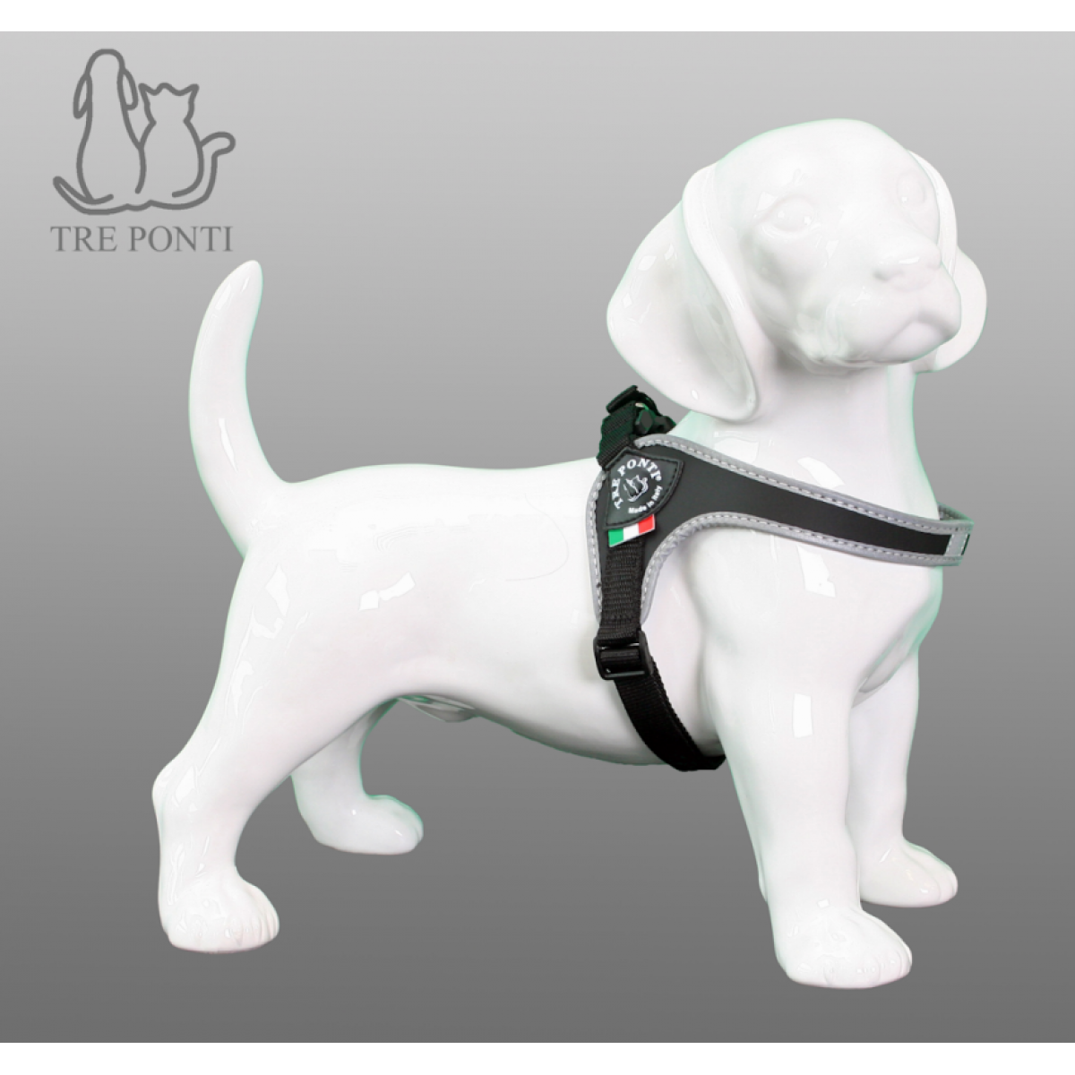 De Fibbia verstelbaar met de zilveren reflective omlijning en kliksluiting. De herkenbare Treponti-look, de prachtige materialen, met een nylon verstelbare buikband. Tre Ponti tuigen zijn allemaal gebaseerd op het idee een zo optimaal mogelijke bewegingsvrijheid te verlenen tijdens het gebruik van de tuigen, zonder enige overbodige druk, wrijving bij de oksels en/of vorm van obstructie van de bewegende delen van de hond.