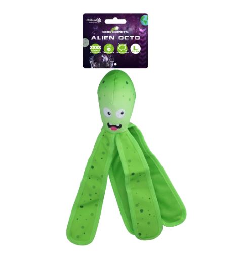 De Dog Comets Alien Octo is op aarde geland! Dit buitenaardse vriendje neemt elke hond graag mee op avontuur. De Alien Octo heeft een pieper in het hoofd en knisperende tentakels voor extra stimulans en plezier tijdens het spelen. Het speeltje drijft ook nog eens op water, waardoor het ideaal is voor honden die graag in het water spelen. Dankzij het stevige canvas en de dubbelgestikte naden gaat dit speeltje lang mee.